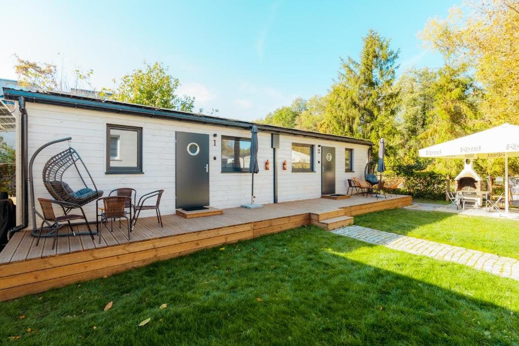 Cada unidad climatizada en Domki Wrocław dispone de una sala de estar, dos dormitorios independientes y un baño con ducha. Las cocinas americanas están equipadas con placas eléctricas, frigoríficos, microondas, utensilios de cocina y mesas para comer o preparar alimentos por cuenta propia. Las habitaciones incluyen televisores pantalla plana, armarios o roperos, escritorios para trabajar, sofás cama y almohadas sintéticas sin plumas para mayor comodidad, también se proporcionan toallas y ropa de cama.
