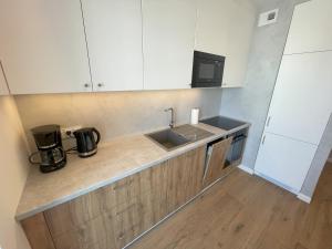 Die Unterkunft umfasst ein Schlafzimmer mit zwei Betten sowie eine Kochnische, ausgestattet mit Backofen, Kochfeld, Kühlschrank, Geschirrspüler, Mikrowelle, Kaffeemaschine sowie Tee- und Kaffeezubereitungsmöglichkeiten. Küchenutensilien und ein Esstisch stehen den Gästen zur Verfügung. Das Badezimmer ist mit Badewanne und Dusche sowie Körperseife und einem Haartrockner ausgestattet.