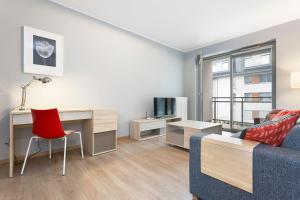 En su interior, el apartamento dispone de un dormitorio, una sala de estar con sofá cama y un baño equipado con ducha a ras de suelo y secador de pelo. La cocina americana completamente equipada incluye electrodomésticos modernos como frigorífico, lavavajillas, microondas, tostadora y hervidor eléctrico, además de utensilios de cocina y mesa para comer para mayor comodidad. Entre las comodidades adicionales se encuentran calefacción, plancha con tabla para planchar, armario o ropero, escritorio para trabajar, lavadora y tendedero.