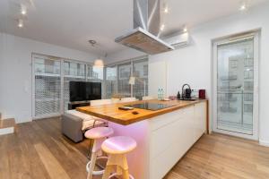 Жильё состоит из двух отдельных спален и гостиной с раскладным диваном и телевизором с плоским экраном. Полностью оборудованная кухня оснащена современной техникой: плитой, духовкой, посудомоечной машиной, микроволновой печью, кофемашиной, электрическим чайником и всей необходимой кухонной утварью. Для удобства гостей предусмотрены утюг с гладильной доской и сушилка для одежды.