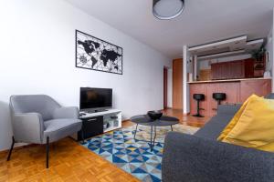 L'appartamento con una camera da letto comprende un soggiorno con TV a schermo piatto con canali satellitari e due letti per garantire comfort durante il sonno. L'angolo cottura completamente attrezzato è dotato di forno, microonde, piano cottura, frigorifero oltre ad accessori per tè e caffè. Gli ospiti troveranno inoltre ferro da stiro con asse da stiro, stendibiancheria, riscaldamento, divano letto nella zona salotto nonché asciugamani e biancheria da letto.